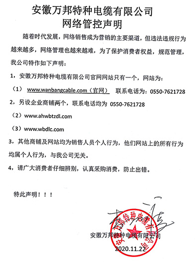 鄭重聲明:安徽萬邦特種電纜有限公司官方網站為:www_wanbangcable_com.selman.cn,除此之外無任何子網站或合作網站,其余均為假冒偽劣。電話:0550-7621728 13485756353 地 址:安徽省天長市滁州高新技術產業開發區經四路29號